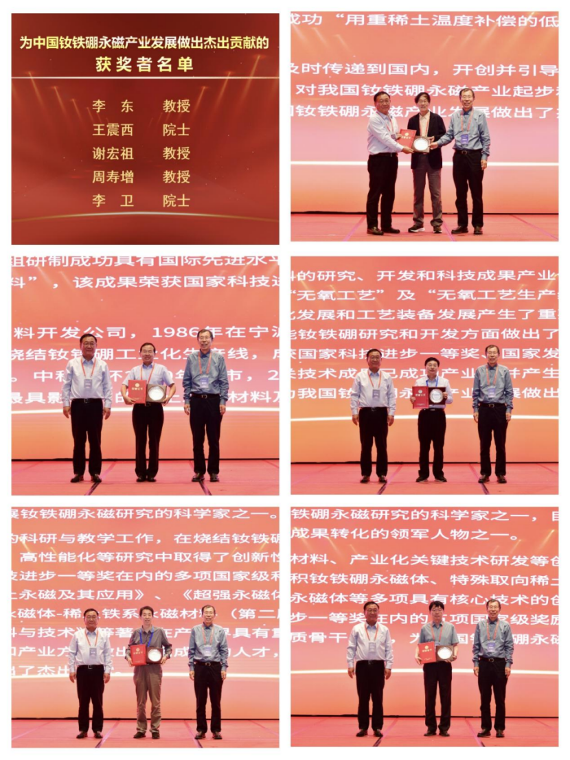 在中国钕铁硼永磁产业发展四十年过程中,有成千上万的人员在钕铁硼产业高速发展过程中对生产工艺、关键技术、质量监控、市场营销以及企业管理等方面作出了重要贡献。会议隆重表彰了为中国钕铁硼永磁产业发展做出重要贡献人员,现场播颂87位“为中国钕铁硼永磁产业发展做出重要贡献”的人员名单,中国稀土行业协会会长、中科院院士张洪杰,中国稀土学会理事长李波共同为“推动中国国钕铁硼永磁产业发展杰出贡献奖”获奖人员颁奖,他们分别是李东教授、王震西院士、谢宏祖教授、周寿增教授和李卫院士。